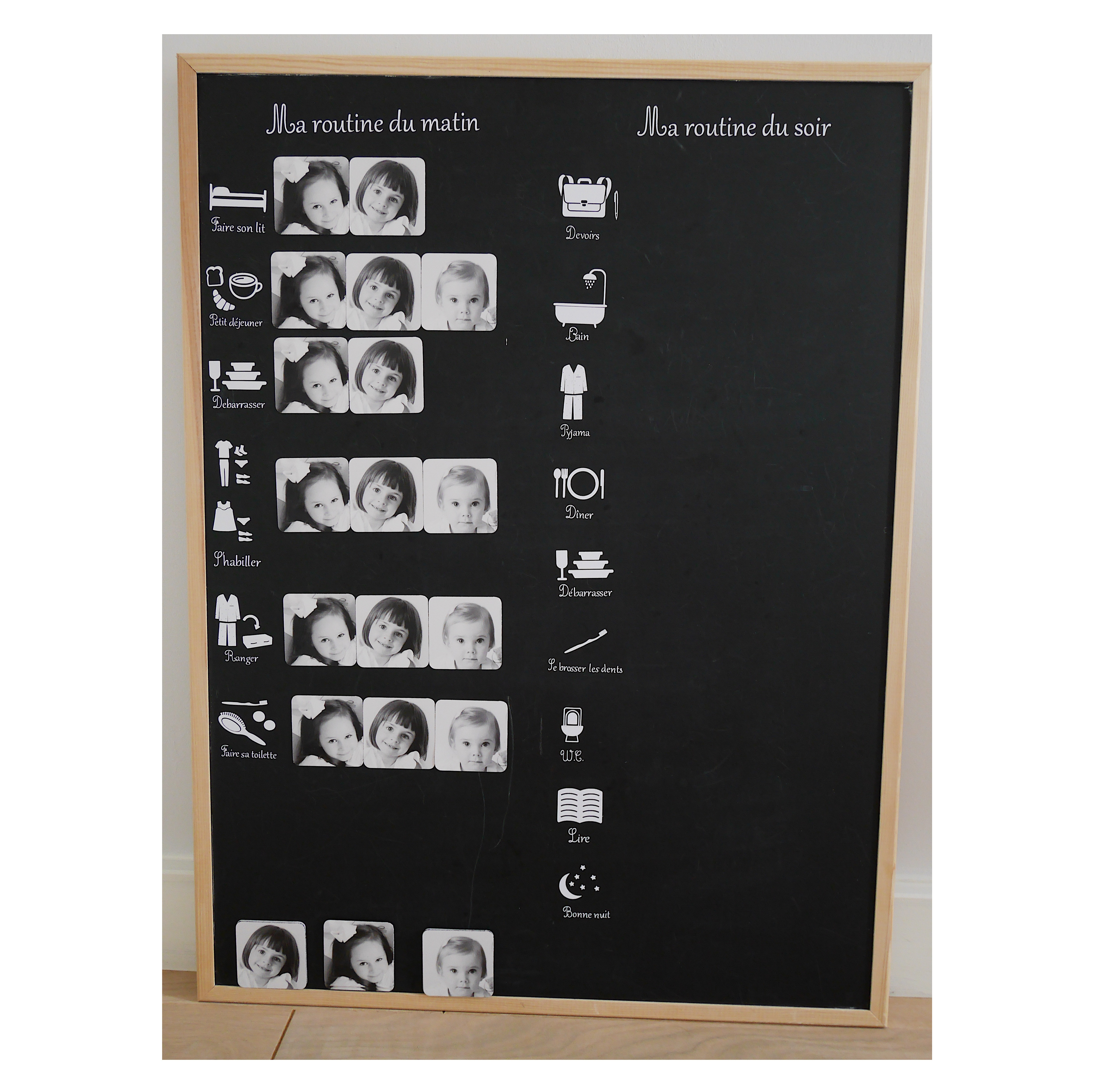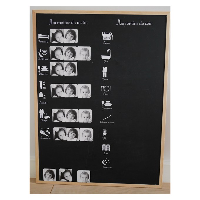 Les enfants ont une liste de choses à faire tous les matins et tous les soirs. Toutes ces tâches sont représentées sur le tableau par un pictogramme (par exemple le dessin d’un cartable pour « faire ses devoirs » ou une baignoire pour « prendre son bain »). A chaque fois qu’une de nos filles réalise une action, elle place sa photo en face du dessin correspondant. Le but étant de tout remplir le matin avant de partir et le soir avant de se coucher. J’ai rajouté une sonnerie récurrente sur mon téléphone tous les matins de la semaine pour prévenir du moment où il faut aller mettre ses chaussures (cette sonnerie guide tout le monde le matin pour prévenir qu’il reste 5 minutes avant de quitter la maison).