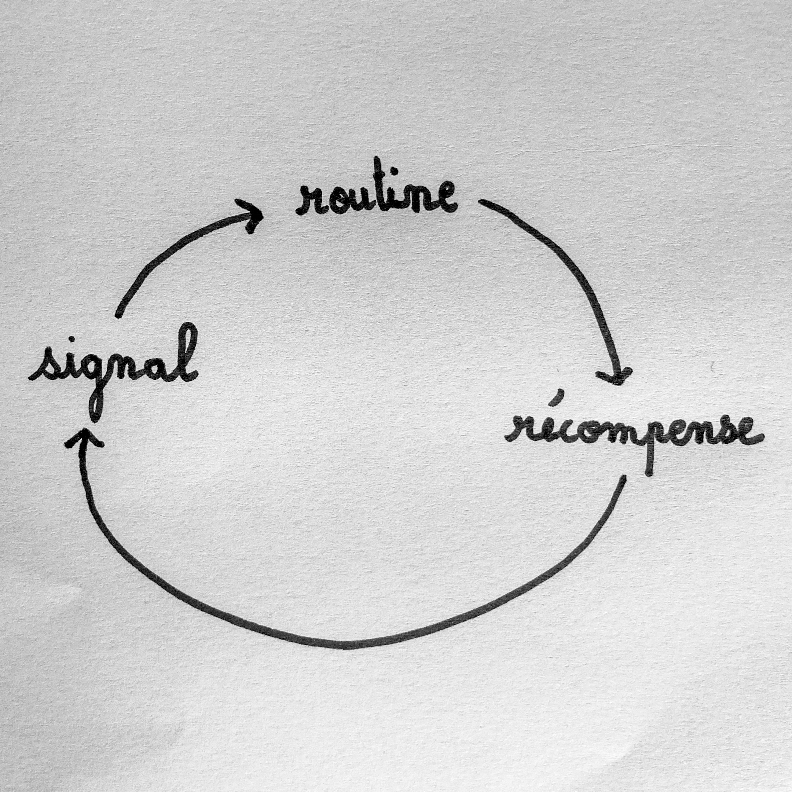 - Ensuite vient la routine qui est l’habitude elle-même. C’est l’action enclenchée par le stimulus.